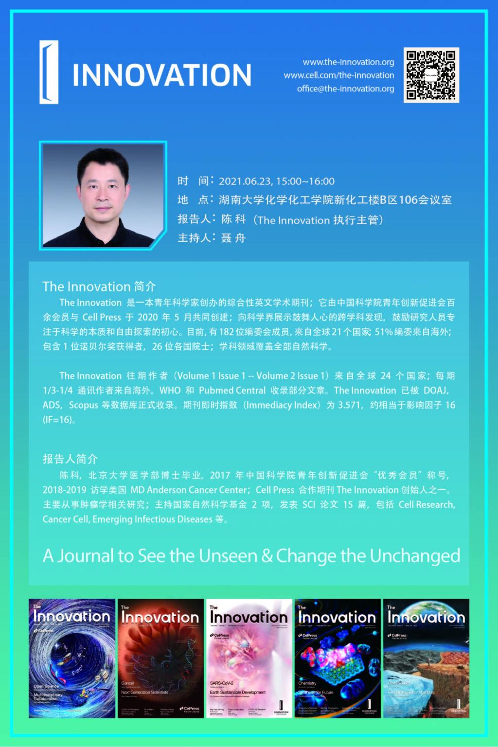 學(xué)術(shù)地點(diǎn) 化學(xué)化工學(xué)院新化工樓B區(qū)106會議室 主講人 陳科(The Innovation執(zhí)行主管)