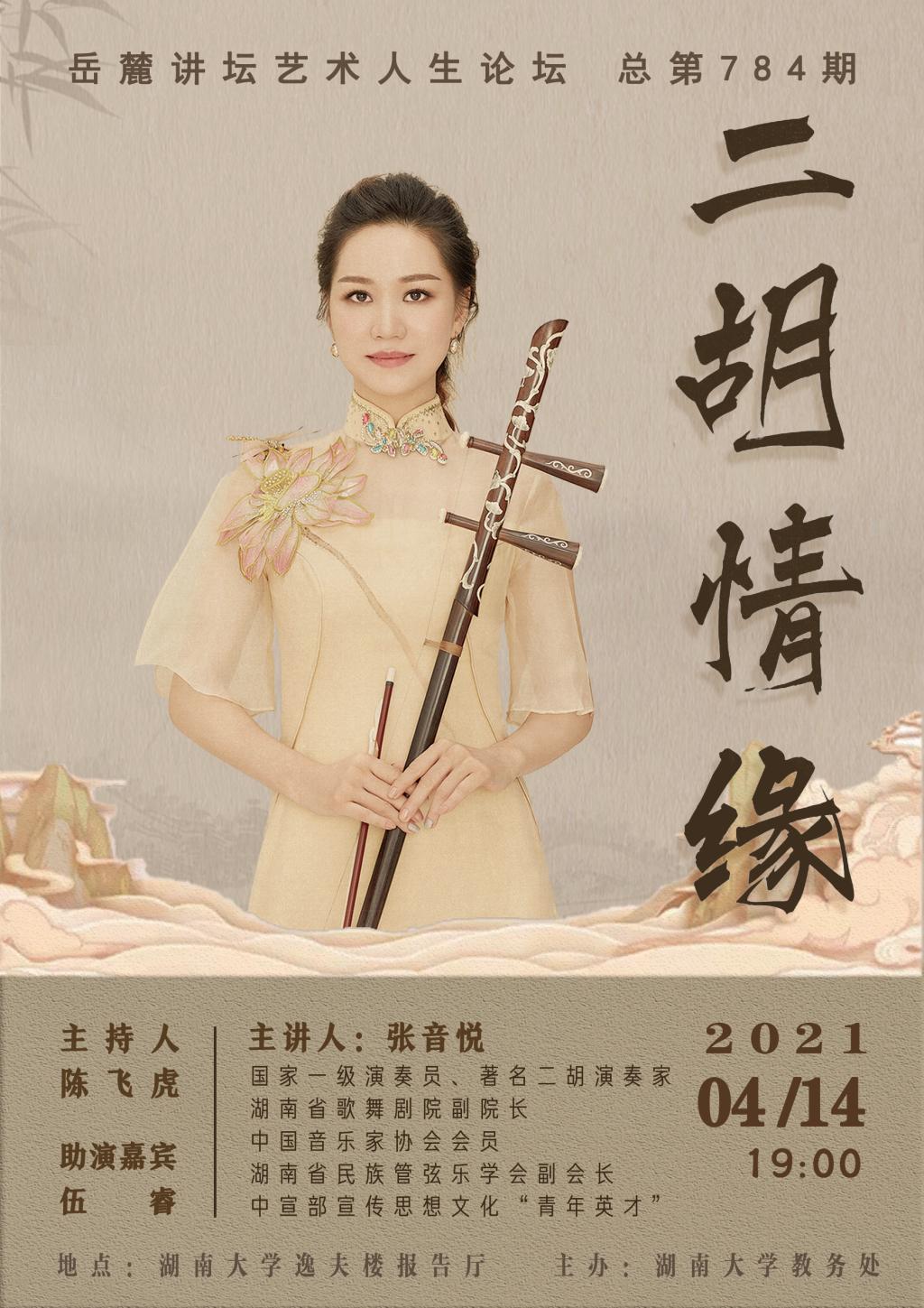 主講人:張音悅(國家一級演員,著名二胡演奏家,湖南省歌舞劇院副院長,中國音樂家協會會員,湖南省民族管弦樂學會副會長,中宣部宣傳思想文化“青年英才”)